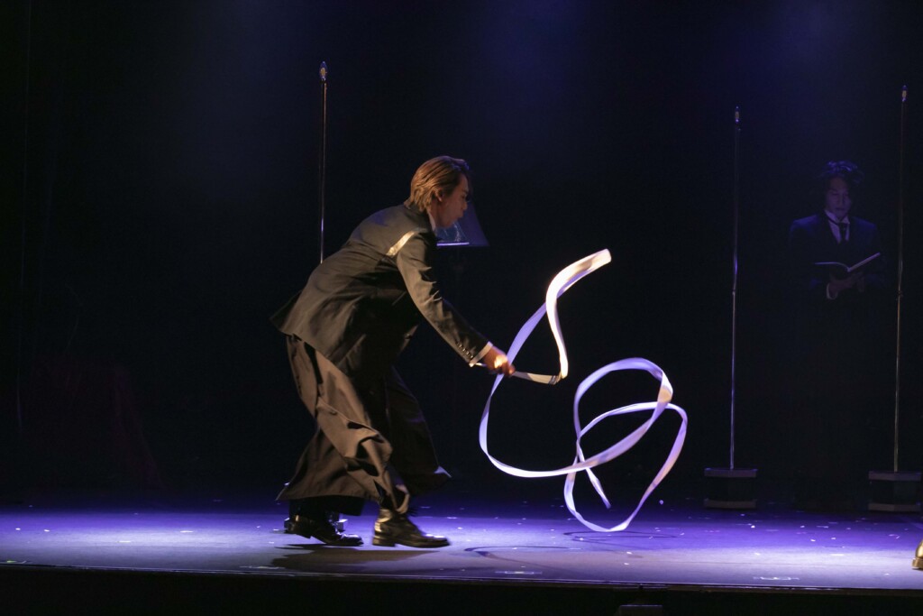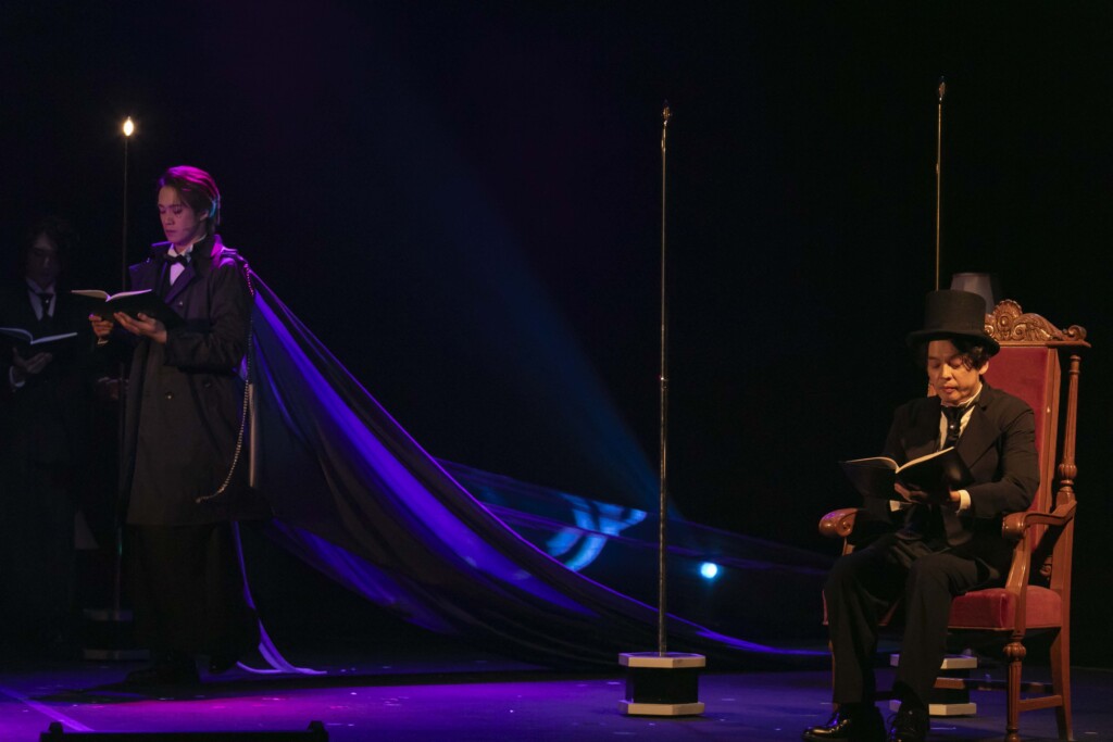 三井:舞台上にある小道具を役者たちで動かしながら、絵変わりを表現するところです。そのような細かいギミックも全部自分たちでやるものですから意外にやることが複数ありまして、マルチタスクをしなくてはいけないところは少し苦労したかなと思っています。今回の作品は、朗読劇の”声”で表現する部分と、僕たちの”身体”を使ってお客様にお芝居を届けるというところのいいとこ取りで、良い意味で混じり合った作品であるなと思いますので、お客様に魅力的に感じていただける作品になっているのではないかと思っております。