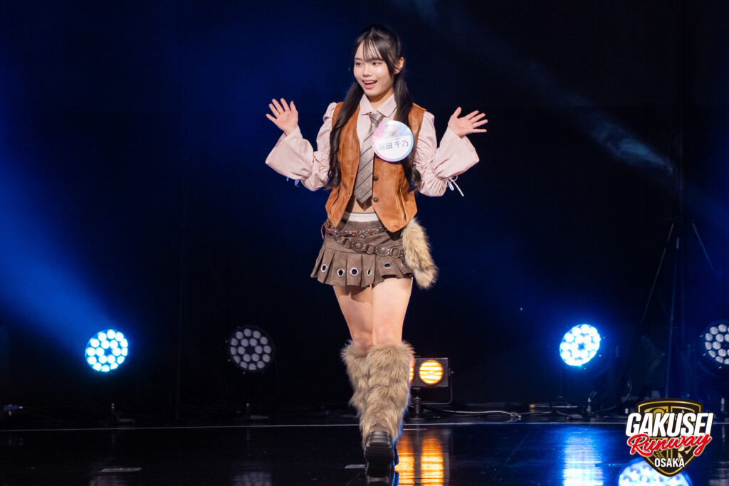 今回のランウェイは悔いのないウォーキングが出来てとても楽しかったです。ステージからはお客さんがたくさん見えて、自分の名前も多くの方に呼んでいただけました。今回出場するにあたり、特にファッションを意識しました。衣装のテーマはカールガールというもので、最近の流行であるベルトを2つ付けたり重ねたりしています。